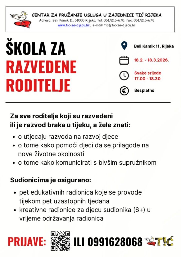ovim putem najavljujemo novi ciklus Škole za razvedene roditelje koji će se odvijati svake srijede od 18.2. do 18.3.2026. od 17 do 18.30 na adresi Beli Kamik 11 u Rijeci. Centar za pružanje usluga u zajednici Tić, Rijeka provodi ovaj program od 2007. godine, a namijenjen je roditeljima koji su razvedeni ili je proces razvoda braka u tijeku. Cilj programa je olakšati prilagodbu djece i roditelja na nove životne okolnosti, pomoći u smanjivanju opterećenja uvjetovanih rastavom uz jačanje roditeljske kompetencije u odgoju, a time i osjećaja zadovoljstva roditeljskom ulogom.
